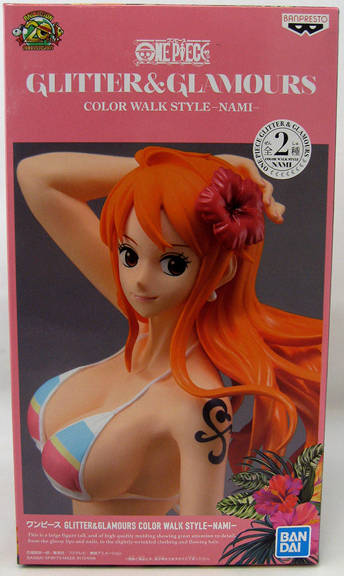 Description: From Banpresto. From One Piece, Nami once again joins the Glitter & Glamours figure line. This Color Walk Style figure features the pirate enjoying the day at the beach showing off her stylish bikini. This sassy Nami stands about 9.80" tall and comes with a base for display.