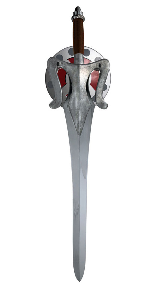 Description: Based on the small plastic sword accessory that accompanied the original He-Man action figure, Factory Entertainment's artisans reimagined it as a real-world sword and have forged a stunning artifact that bridges the realms of fantasy and reality. This officially licensed 40-inch long Power Sword prop replica features a full tang blade crafted from stainless steel with a mirror-chrome finish. Adding realism to this iconic sword, the metal guard features an antique foundry finish and the handle is wrapped in a brown leather. Every replica is supplied in a full color collector box and comes with a wall hanging display plaque and a Certificate of Authenticity. .