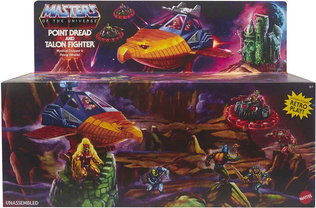 Description: Talon Fighter and Point Dread join the Masters of the Universe Origins line! This incredible aerial transport vehicle can fit up to two Origins action figures (figures with tails, wings and/or capes may not fit)(figures not included). The Talon Fighter also comes with a dedicated landing base, Point Dread. The Masters of the Universe Origins Point Dread and Talon Fighter Playset measures approximately 9-inches tall x 12-inches long x 11-inches wide. Ages 6 and up. .