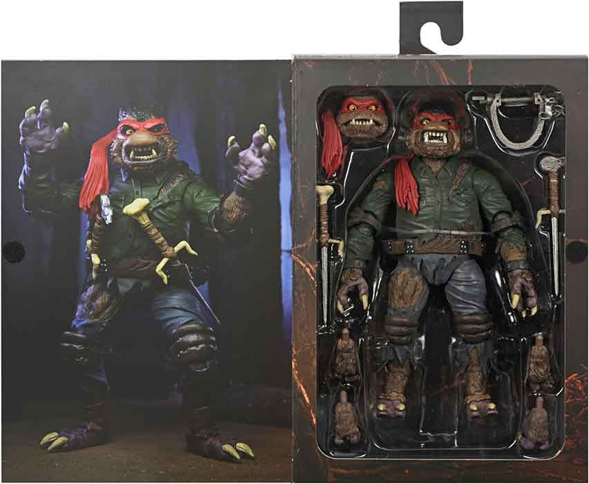 Description: The next release in NECA's Universal Monsters x Teenage Mutant Ninja Turtles action figure line is Raphael as the Wolf Man! This continuing line pays tribute to the world's most famous turtles and Universal's icons of horror. This 7" scale action figure reimagines Raphael as the tragically doomed Wolf Man, and he's packed with accessories. This fully articulated figure includes two sais that fit into his belt (one of which is styled after the movie's wolf head cane), two interchangeable heads, swappable hands, and animal trap. Comes in collector-friendly window box packaging with opening flap featuring an all-new illustration by Daniel Horne..