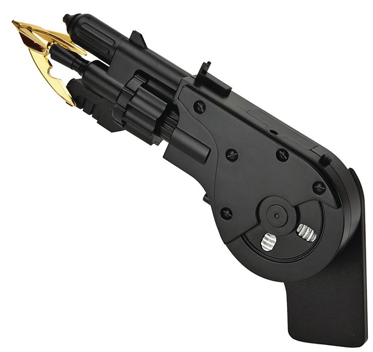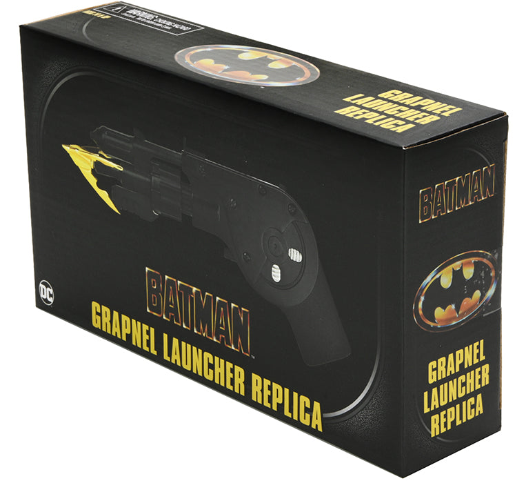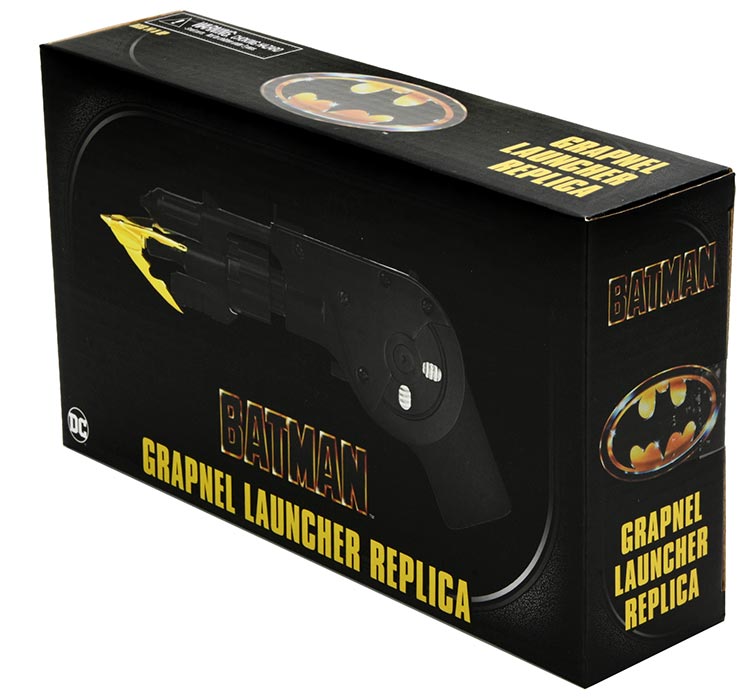 Description: From the 1989 movie that defined Batman for the modern generation! This full-size replica of Batman's signature gadget, the Grapnel Launcher, is over 7" in length, with a screen-accurate foldable handle, grapnel hook attachment and a motorized spool that retracts the rope and hook after firing. Uses 2 LR1 batteries, not included. .