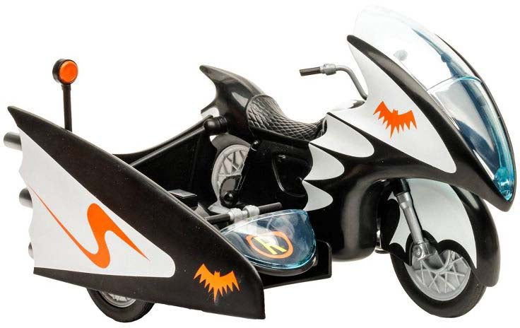 Both Batcycle and side car both having rolling wheels Packaged in an open box with the iconic old school look of the 1960's Batman series.