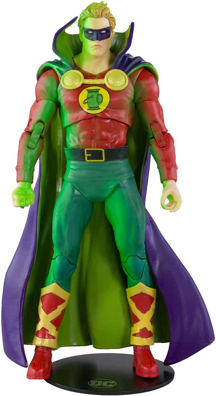 Green Lantern Alan Scott includes a lantern, attachable flame accessory, exclusive card stand and base