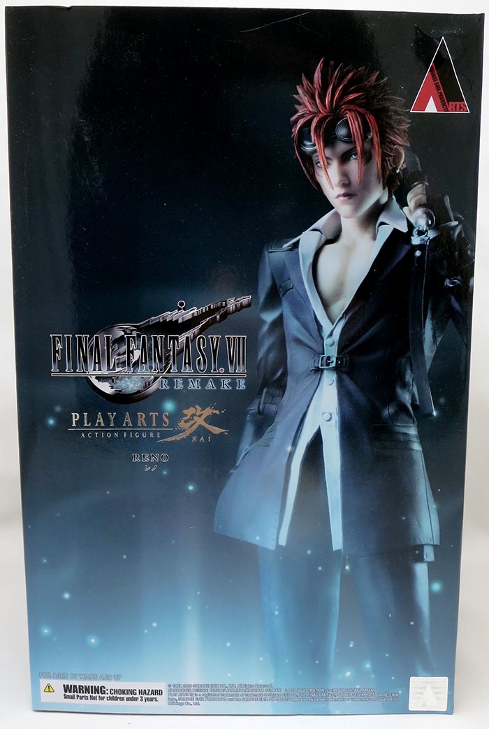 Description: From Square Enix. From Final Fantasy VII Remake, Reno, a member of the elite Shinra squad called the Turks, makes an appearance as a Play Arts Kai figure! His slim silhouette, the suit he casually wears, and his eye-catching red hair are some of the delicate details that were faithfully recreated in this figure. Reno comes with his weapon of choice, a baton, various interchangeable hand pieces, and two additional head pieces that feature different facial expressions. This 10 7/8" tall figure encapsulates Reno's capricious and elusive presence, just like in the game. Figure includes display stand.