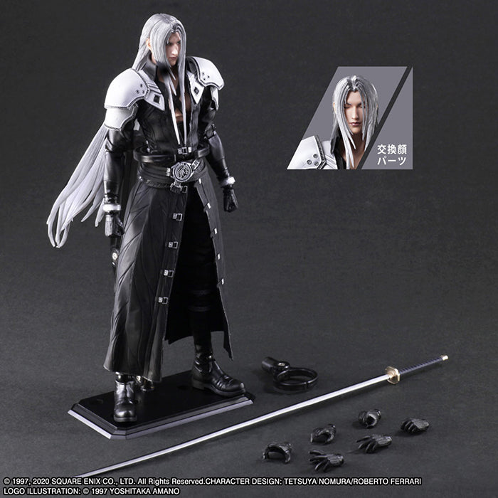 Description: From Square Enix. Sephiroth, the legendary Soldier First Class from Final Fantasy VII Remake joins the fray as a Play Arts Kai action figure! Our designers have painstakingly recreated all the fine details you can see in the character from FFVII Remake from his enigmatic expression, his slender but brawny figure, to all the other intricate decorations. His silver hair utilizes a translucent piece and is articulated as well; making it possible for dynamic posing. Accessories include his trusty Masamune sword, an additional head piece with his eyes closed, and interchangeable hands, for a total of six additional pieces. This exceptional 11 1/8" tall figure shows off the powerful presence of an infamous war hero and enigmatic villain.