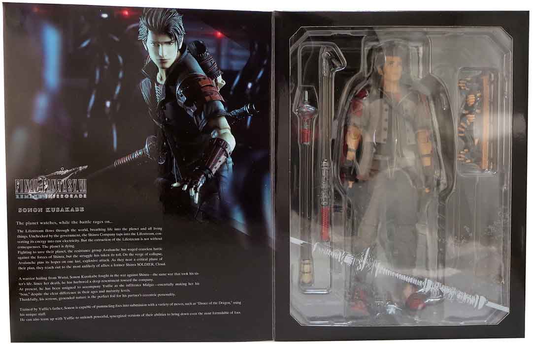 Description: From Square Enix. From Final Fantasy VII Remake Intergrade, Wutaian warrior Sonon Kusakabe and Wutaian ninja Yuffie Kisaragi join the fray as a PLAY ARTS KAI action figure! From his strong but gentle facial expressions to his brawny physique, Sonon's contrasting look from his partner is nicely recreated in this figure. From her jovial facial expressions to her nimble limbs and her iconic moogle cape, we spared no effort to recreate Yuffie's updated look from the remake. Figures include display stand..
