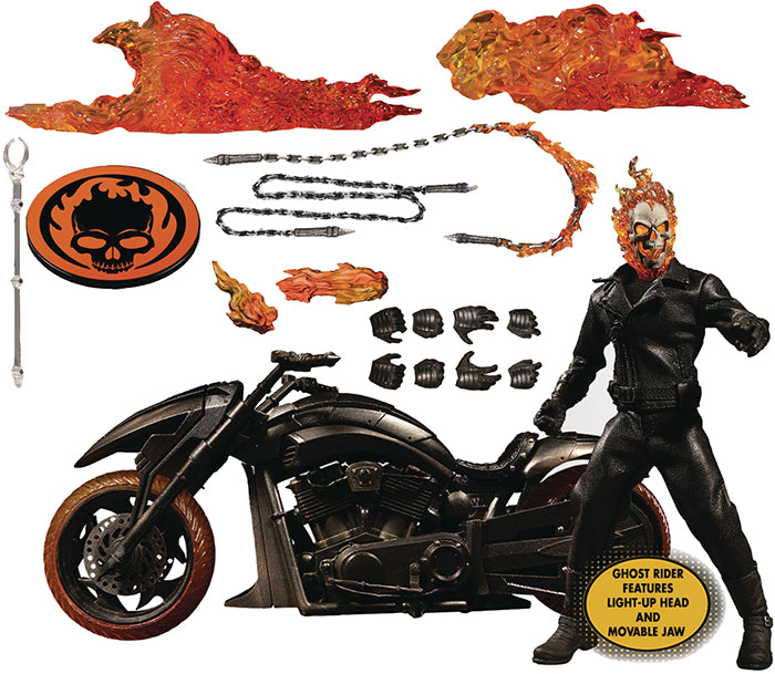 Description: From Mezco Toys. The Ghost Rider joins the One:12 Collective along with his Hell Cycle, featuring a light-up function, removable flames, and sound feature! The One:12 Collective Ghost Rider is outfitted in motorcycle gear from head to toe: a black shirt under his leather-like jacket, leather-like pants, motorcycle-riding boots, and gloves. The Spirit of Vengeance comes complete with a light-up head portrait that flickers, achieving a realistic flame effect. Ghost Rider is equipped with his lethal Hellfire Chain that he can hold, as well a poseable, real metal chain. The Hell Cycle features a light up function which illuminates the removable flame effects, and a revving sound feature. Ghost Rider can sit atop the Hell Cycle and hold on to both handles. Each figure is packaged in a collector friendly box..