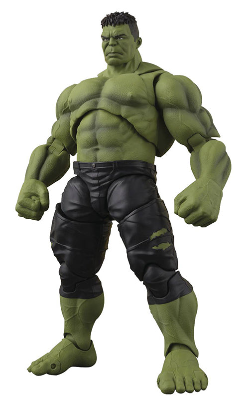 Description: From Tamashii Nations. Based on the Green Goliath's appearance in Avengers: Infinity War, this detailed figure of The Hulk stands 8 1/4" tall and has been recreated using Bandai's special Tamashii digital coloring technique. The figure comes with two alternate facial expressions and a pair of left & right hands.