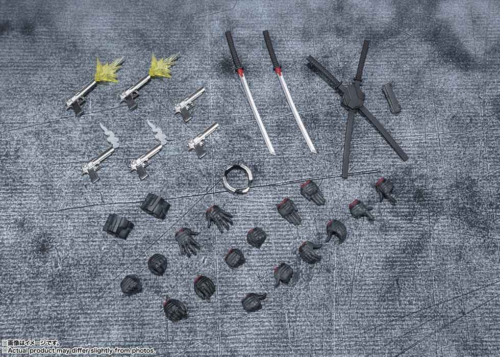 Description: Deadpool, as seen in Deadpool 2, arrives with gun effect parts, a holster, and tons of accessories for you to re-create your favorite scenes! Includes: Three pairs of optional eyes, Eight pairs of optional hands, Two swords, Scabbard, Gun (normal) x2, Gun (with firing effect) x2, Gun (with smoke effect) x2, Holster (x2), Knife, Knife case, and Bomb collar .