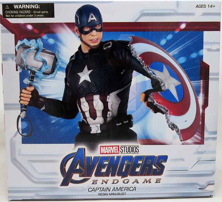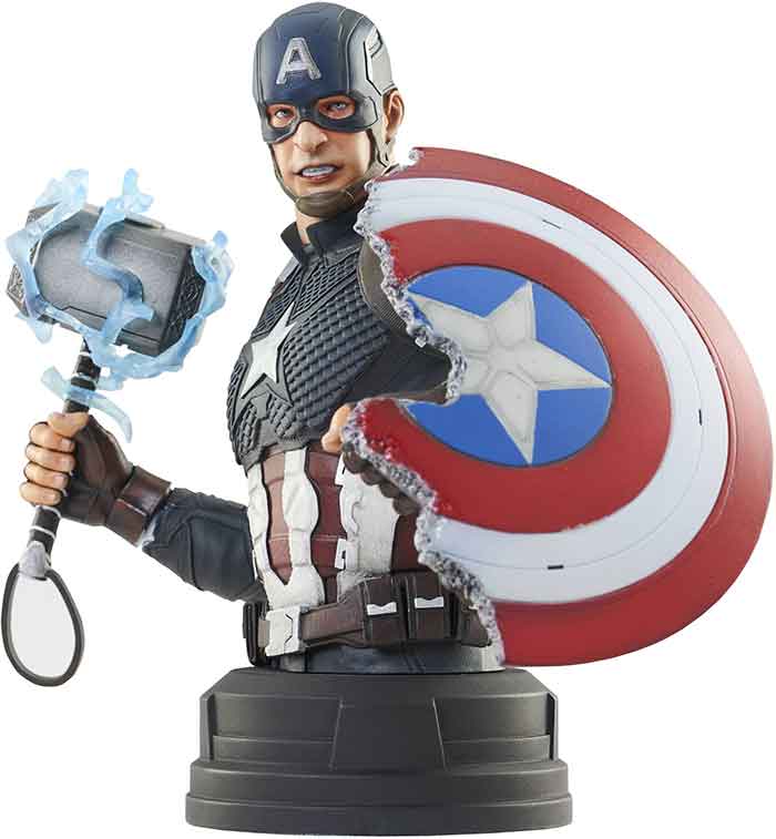 Description: Avengers Assemble! Captain America leads the charge against Thanos with this all-new 1/6 scale mini-bust! Standing 6 inches tall, Cap wields Mjolnir while he holds his damaged shield, all atop a pedestal base. Limited to only 3000 pieces, this sculpture features detailed sculpting and paint applications and comes packaged in a full-color window box. Designed by Joe Allard, sculpted by Joe Menna!.