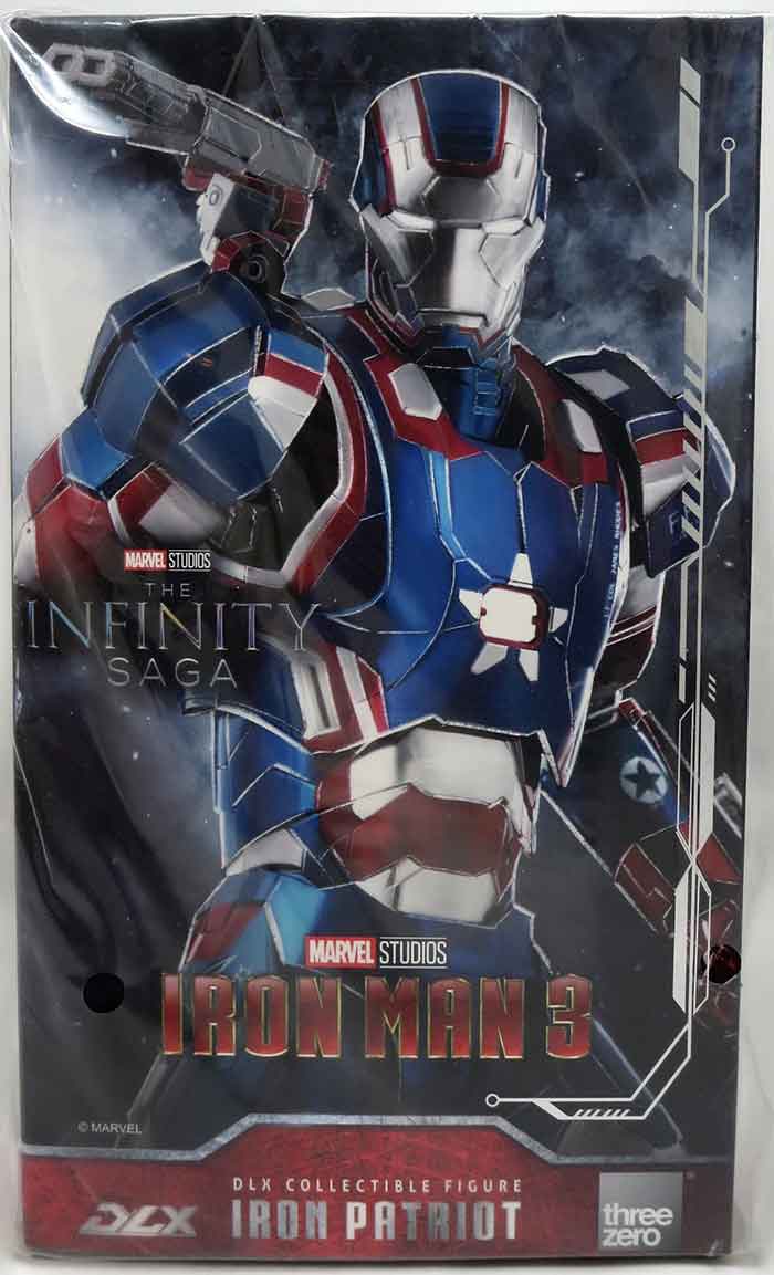 Description: threezero's popular new DLX series based on characters from Marvel Studios' The Infinity Saga continues with the DLX Iron Patriot as the next release. This fully-articulated collectible figure stands at 6 7/8" tall and is constructed of threezero's renowned DLX die-cast system with over 48 points of articulation. DLX Iron Patriot's classic blue and red armor is brought to life with mobile accessories. Its back-mounted cannon can be rotated for different over-the-shoulder poses, the attachable micro-cannon can be fixed onto both forearms, and flying effects can be attached to the feet for action poses. The figure also features two lighting functions in both the chest and the eyes. The Infinity Saga - DLX Iron Patriot figure also includes various pairs of interchangeable hands and one DLX action stand. .