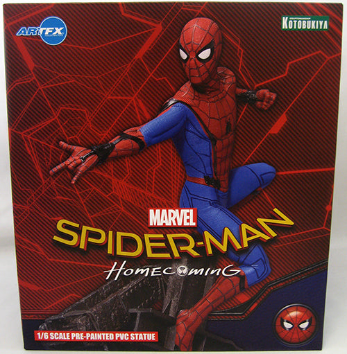 Description: From Kotobukiya. The long-awaited Spider-Man is finally making his homecoming! After his reboot in Marvel Studios' 2017 summer blockbuster, Spider-Man: Homecoming, the popular rookie hero is making his way to Kotobukiya's ARTFX series of 1/6 scale figures! Spidey is perched on a base of metal debris that evokes the scene from the trailer when a passenger ferry is torn completely in half. The Wall-Crawler is posed heroically with his webshooter at the ready, donning his Spider-Man suit created by Tony Stark. The hero is sculpted down to the finest detail thanks to the craftsmanship of Dave Cortez, the expert behind Kotobukiya's previously released Star Lord with Groot ARTFX statue.