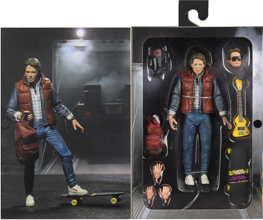 Description: It's time to hop in the time machine and go back to 1985! NECA is thrilled to present Ultimate scale figigures from the Back To The Future trilogy! The figures of Marty McFly feature the officially licensed likeness of Michael J. Fox. The Back to the Future Marty sports his signature vest and denim jacket, and the Back to the Future 2 Marty has his self-adjusting jacket and auto-tying shoes. The Biff Tannen figure is ready to bully George McFly in 1955. Each figure comes with accessories. Window box packaging.