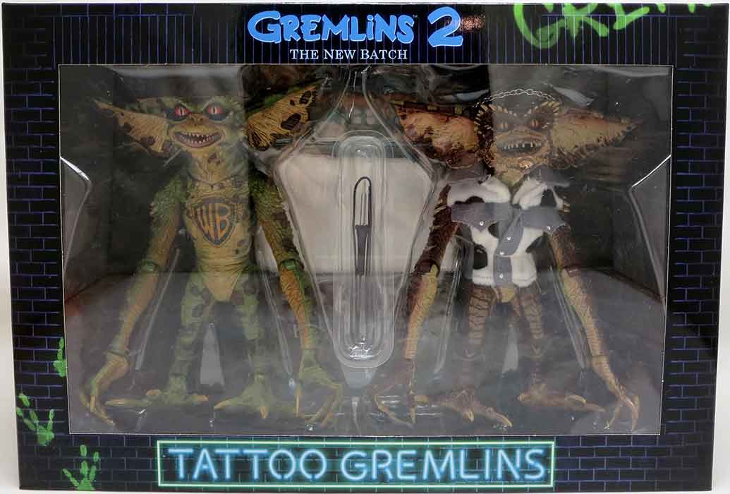 Description: The Gremlins are back, and this time they've taken control of a high-tech skyscraper in New York City! From the sequel movie Gremlins 2: New Batch, these two 7" scale, fully articulated Gremlins figures (approximately 6" tall) have taken up residence in a tattoo parlor and are ready to show off their new ink. They come with interchangeable hands, tattoo instrument, mallet, sunglasses, riding crop, plus fabric towel and jean vest. Window box packaging. .
