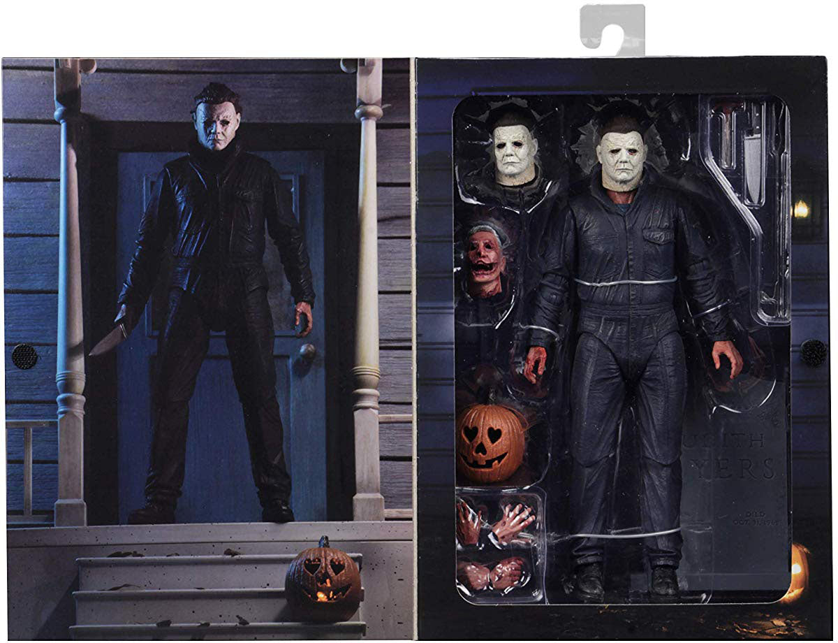 Description: Michael Myers returns to NECA's action figure line! Based on his appearance in the thrilling new Halloween movie, this all new Michael stands over 7" tall and has received the Ultimate treatment, with over 25 points of articulation and tons of accessories. The Ultimate Michael Myers figure comes with 2 heads, knife, hammer, jack o' lantern, interchangeable hands, and more. Comes in display-friendly deluxe window box packaging with opening flap.