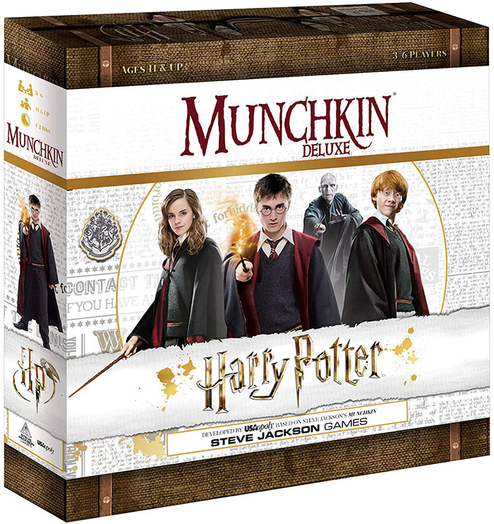 Description: Get ready for an epic duel in this collectible Munchkin game featuring artwork, characters, and spells from the Harry Potter movies where you race to prove your mettle against other witches and wizards Play as a member of your favorite Hogwarts house - Gryffindor, Slytherin, Hufflepuff, and Ravenclaw Defeat villains and monsters all while outwitting the other players - but watch out for wandering monsters to derail your progress Includes 168 Cards with Colorful Movie Imagery, 8 Character Cards, Custom Die, and Custom Game board 3-6 Players | Ages 11+ | 60 Min Play Time