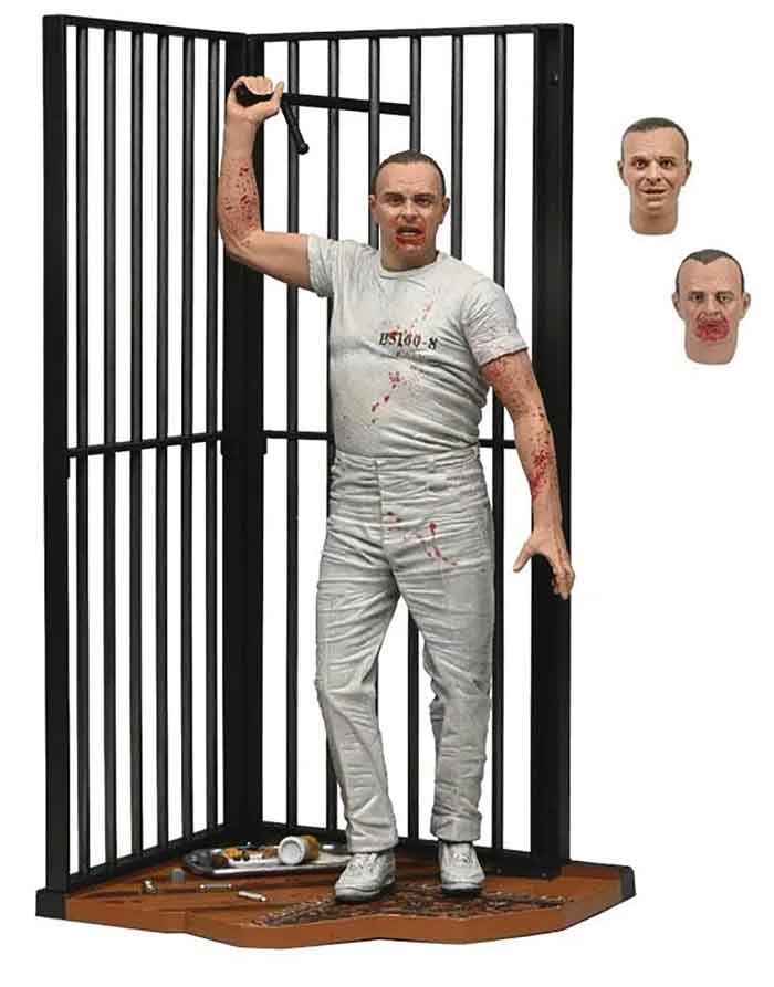 Description: Add the iconic prison escape scene from The Silence of the Lambs to your horror collection! This chilling figure of Dr. Hannibal Lecter in his blood-spattered, white prison uniform captures the moment he takes murderous revenge on his captors. Portrayed by Oscar winner Anthony Hopkins, the brilliant and psychotic doctor comes to life as a 7" scale action figure with interchangeable heads, baton, and diorama base of his prison cell escape scene..