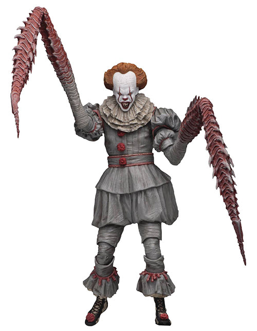 Description: From the acclaimed 2017 horror film IT, drawn from the pages of Stephen King's original novel, NECA presents Pennywise: The Dancing Clown! Based on Bill Skarsgård's portrayal of the nightmare-inducing clown, this 7" scale figure has been painstakingly detailed to be as accurate to Pennywise's ornate costume as possible, and is presented in an Ultimate format with special packaging and LED lights inside one of the heads. This version features 4 head sculpts, 3 of which are all-new heads: "Judith" Painting Head, "Emerging Arms" Head, and Light-Up "Deadlights" Head with LED light inside the mouth. The figure also includes interchangeable articulated insect arms, interchangeable forearms, and 2 pairs of hands. The special window box packaging has a fold down flap in homage to the Dancing Clown scene from the film. Uses button cell batteries, included.