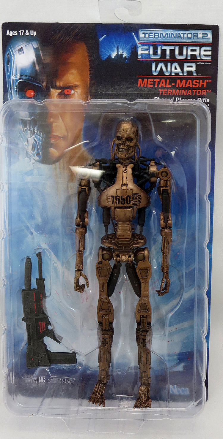 Description: Enjoy a blast from the past with three figures dedicated to the classic Kenner Terminator 2 toys of the early 1990s! Taking inspiration from those designs, our team has transformed these Kenner classics into modern versions with all of today's detail and articulation. Power Arm T-800 features a detailed weapons arm with interchangeable missile launcher and grabbing claw attachments. White Hot T-1000 changes color when dunked in water, just like the original version. Metal Mash Endoskeleton features working pistons and comes with a plasma rifle accessory. Each figure stands approximately 7" tall and is fully articulated. Clamshell packaging.