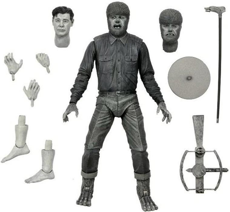 Description: For the 80th anniversary of Universal's horror film classic, NECA is excited to reveal The Wolf Man in Ultimate action figure form! Starring Lon Chaney Jr., 1941's The Wolf Man is critically acclaimed for Chaney's moving performance and the special effects. The sculpt captures the human and monster sides of this complicated character with interchangeable heads, hands, and lower legs. The figure stands in 7" scale, features the authorized likeness of Lon Chaney Jr, and also includes wolf cane, animal trap and stand accessories. Presented in authentic black and white deco, like the original film. Display-friendly window box packaging with opening front flap..