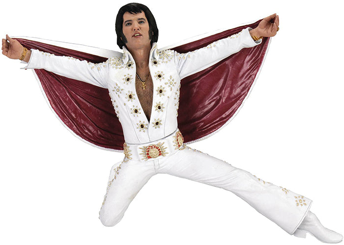 Description: From NECA. The King of Rock and Roll has arrived! NECA is proud to announce that Elvis Presley, the best-selling solo musician of all time, will be joining their line of 7" scale action figures! The NECA studio artists have recreated Elvis's live in concert appearance from the Spring of 1972 in painstaking detail. Wearing a white jumpsuit decorated with various sequins and jewelry, he is sculpted to precision in the iconic cape spread pose!