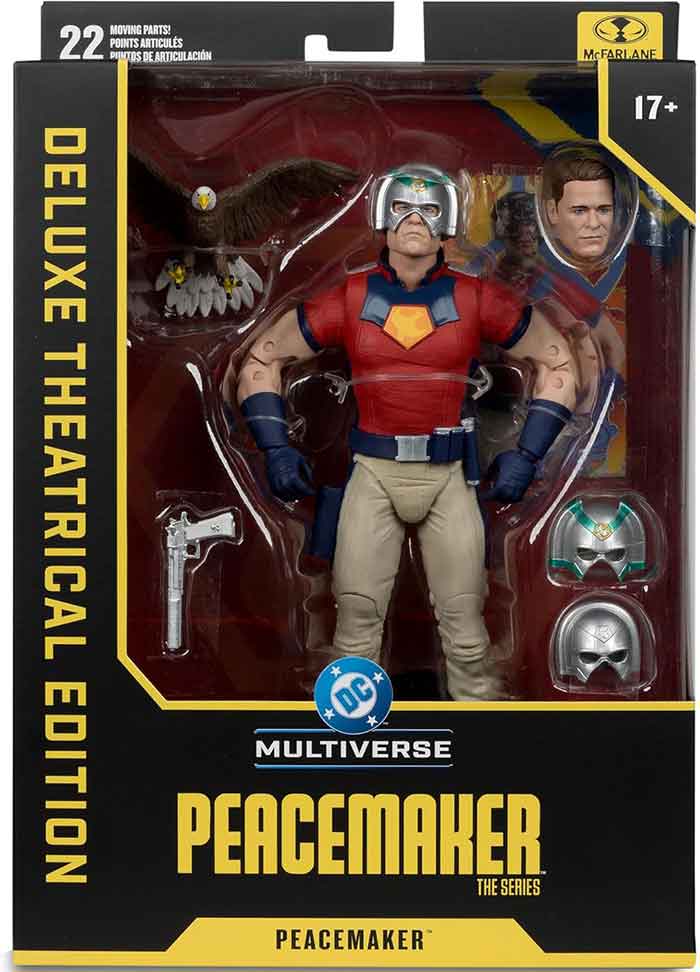 Accessories include Peacemaker’s big gun, 3 interchangeable helmets, Eagly, unmasked head portrait and figure display base