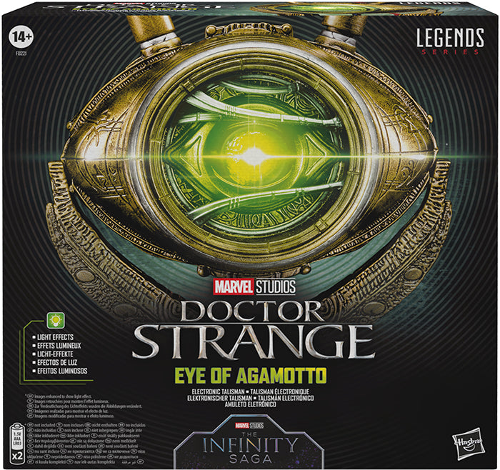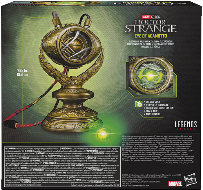 Description: Green and glowing at the center, this premium role play Eye of Agamotto electronic talisman is the ultimate combination of costume and collectible! Specifically modeled on the Sorcerer Supreme’s powerful possession, the premium role play Eye of Agamotto talisman is immediately recognizable, with exceptional detailing and premium aged-looking finish for play or display. This Marvel Legends Eye of Agamotto is an exotic addition to any Marvel fan collection..