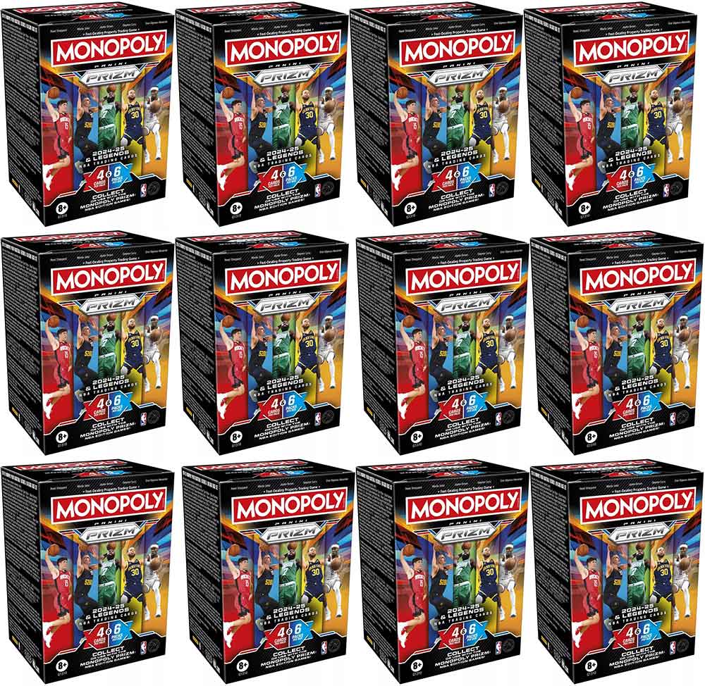 Description: MONOPOLY PANINI PRIZM 2024-25 AND LEGENDS NBA CARDS: This Monopoly Panini Prizm: 2024-25 & Legends NBA Trading Cards Booster Box includes 24 NBA trading cards, featuring 2024-25 season stars and NBA legends