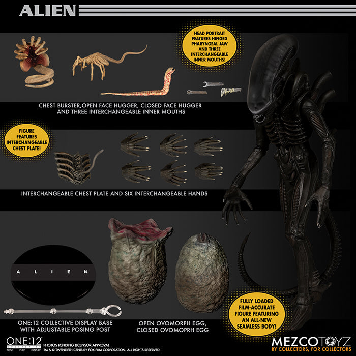 Description: The perfect organism, Alien joins the One:12 Collective! The One:12 Collective Alien features an all-new seamless body designed with an internal skeleton armature that is durable yet highly posable. The hostile xenomorph is equipped with a hinged pharyngeal jaw and interchangeable inner mouths, as well as an interchangeable chest plate pierced by the ASSO-400 Harpoon Grappling Gun, as seen in the final scene of the movie. Alien is fully loaded with film-accurate accessories including a coiled Facehugger that can fit over the heads of most other One:12 Collective figures, an open Facehugger, a Chestburster, and an open and closed Ovomorph egg. Each One:12 Collective Alien figure is packaged in a collector friendly box, designed with collectors in mind. .