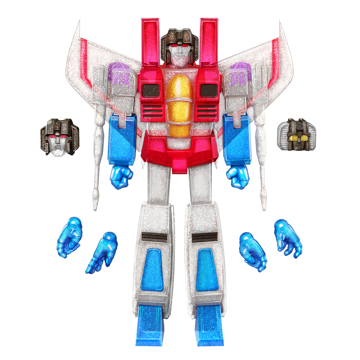 Description: From Super 7. It's your old buddy Starscream! Once relegated to the Decepticon Crypt, now the Ghost of Starscream is free to haunt your Transformers lineup. Based on the episode "Starscream's Ghost" from the original G1 cartoon, Starscream returns as a sparkling robo-ghost after being blasted into oblivion by Galvatron in The Transformers: The Movie. This figure features glitter injected directly into the translucent plastic to achieve this hauntingly beautiful, sparkly look. This 7" highly-articulated deluxe action figure is made-to-order and includes a variety of interchangeable parts, such as a G1 toy-accurate head. .