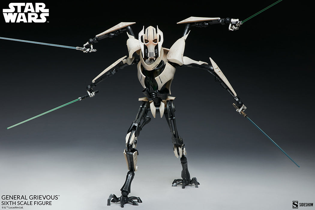 Description: The General Grievous Sixth Scale Figure includes a pair of fused arms and a pair of switch-out split arms for recreating his infamous battle stance. His articulated fingers allow for easy posing alongside the array of accessories in his armory, including a blaster, an electro staff, and his four lightsabers with removable hilts. The figure comes with a black stand base to help balance and support any number of action-packed poses you can devise for this celebrated Star Wars villain. From his intricate mechanical composition to the weathering and battle-damage on his exterior armor, General Grievous is an essential collectible for Star Wars fans of any generation..