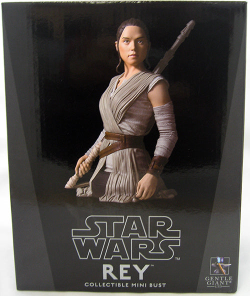 Description: From Gentle Giant. This highly detailed mini bust, was created digitally by the artisans at Gentle Giant Ltd. and captures the likeness of Rey with staff in hand, conveying a sense of calm while holding back a tremendous amount of power that she has yet to realize. Star Wars fans of all ages look forward to Rey's story unraveling as the saga continues! This limited edition, hand-painted, 1:6-scale bust is cast in high-quality polyresin, and comes individually numbered with a matching Certificate of Authenticity. Rey is the perfect addition to your Star Wars collection.