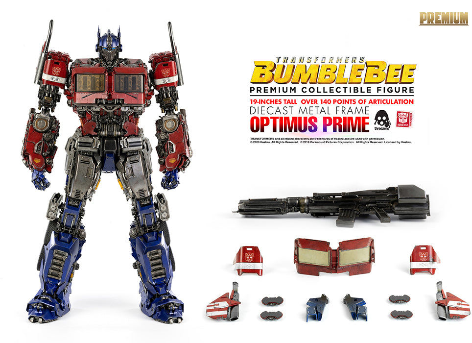 Description: From Threezero. Hasbro and Threezero are proud to present the courageous leader of the Autobots, Optimus Prime as the next exciting character in the Transformers PREMIUM Collectible Figure Series! Premium Collectible Figures are Threezero's top of the line large-format collectibles featuring ultra-detailed sculpts, extraordinary amounts of articulation for maximum poseability, LED illuminated details, die-cast metal parts, and expert paint weathering! Standing an impressive 19" tall, the Transformers: Bumblebee - PREMIUM Optimus Prime collectible figure features over 140 points of articulation including articulated fingers. Additional components include LED illuminated eyes, and interchangeable armor pieces that provide the option of displaying the figure as either Earth Mode or Cybertron Mode! Optimus Prime comes equipped with an LED illuminated Ion Blaster as seen in the film. PREMIUM Optimus Prime also features a Die-cast Metal Frame, adding an incredible weight and tactile finish to the presentation!