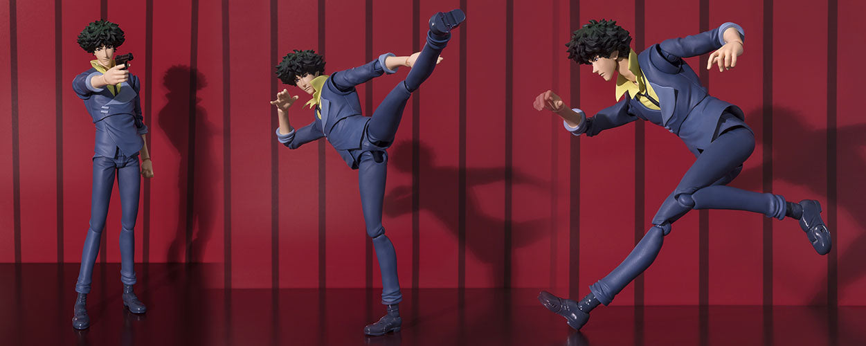 Description: From Tamashii Nations. The legendary star of a legendary anime joins the S.H.Figurarts lineup! Spike Spiegel from Cowboy Bebop is super articulated to capture all of his trademark Jeet Kune Do moves! Also included are 4 exchangeable hand parts, 3 exchangeable face expression parts, a cigarette (attached to face), and a gun!