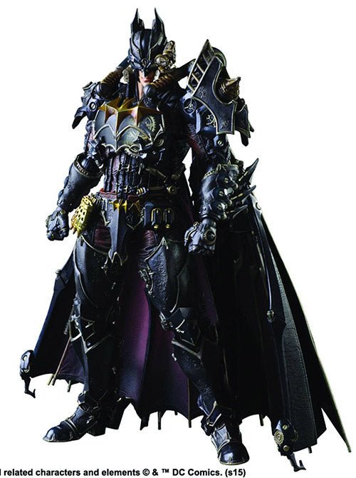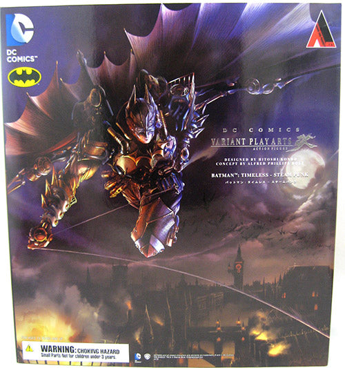 Description: From Square Enix. Square Enix's dream team of designers, sculptors, and engineers has each poured their heart and soul into creating the original designs of the Variant Play Arts KAI figures. Through generations, there has always been a force of justice that agents of crime, chaos, and evil have contended with. Every incarnation of Batman that existed throughout time stood as a beacon of hope and a reflection of the age it is a part of. Inspired by the fantastic sci-fi subgenre of steampunk, the Variant Play Arts KAI "Timeless" series welcomes a new Batman to the fold. His Batsuit, with many design aspects inspired by turn of the century steam powered technology, offers a design that transcends time and space. Fine sculpting and paintwork, as well as careful consideration of the materials used, elevate the unique texture of steam-powered technology's functional beauty. For example, multiple gears and cogs can be seen through a transparent piece in the chest armor, and burnished bronze metallic color is used throughout. This figure has a dignified, almost classical aura, emphasized by a five-layer structure of the cape which hearkens back to designs by da Vinci. The technical machinery would not be out of place in an 1890s Batcave, and the gaslamp atmosphere evoked by the design is a perfect match for the Dark Knight. Figure also includes display stand and interchangeable hand parts.
