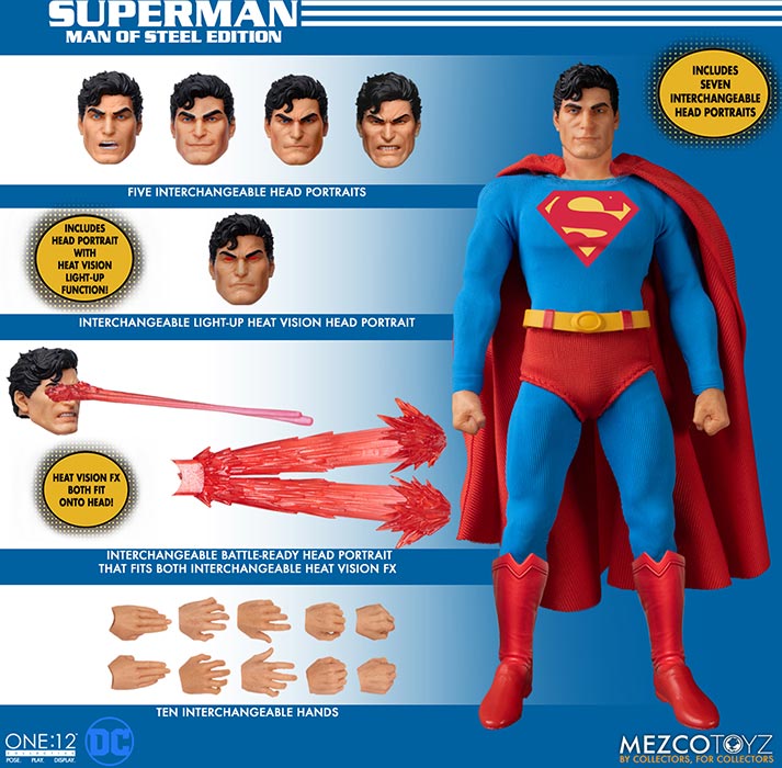 Description: The Man of Steel soars into the One:12 Collective! The One:12 Collective Superman: Man of Steel Edition is outfitted in his iconic suit which proudly displays the House of El family crest and features a cape with an integrated posing wire. He comes with seven head portraits including a light-up heat vision portrait. Superman is prepared to exact swift justice on enemies like Starro - the mind-controlling, intergalactic starfish which attaches to most One:12 Collective heads, and also Black Mercy - a parasitic alien plant with posable tentacles. The Last Son of Krypton comes complete with a Phantom Zone Projector, two punch FX that attach to his hands, three magnetic bullet ricochet FX that attach to his chest, and a Kryptonite display trophy. Each One:12 Collective Superman: Man of Steel Edition figure is packaged in a collector-friendly tin, designed with collectors in mind..
