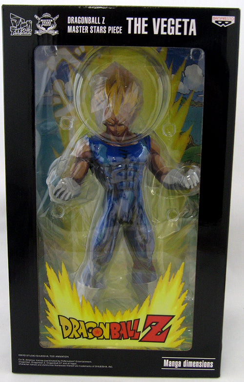 Description: From Banpresto. Manga Dimensions is one of Banpresto's hottest figure design styles to hit the collectibles market. Different from most other figures available, this ground-breaking art style uses a traditional 2D-shading color application making these characters look like they jumped right out of the comics. Fusing this awesome art style with Banpresto's premium quality figure sculpts, Manga Dimensions takes figures to a whole new level. This Manga Dimensions figure of Super Saiyan Vegeta stands 8 3/4" tall.