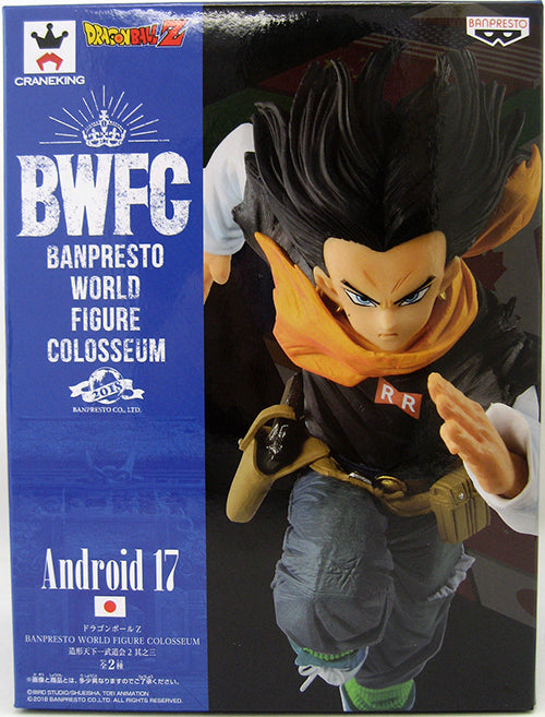 Description: From Banpresto. Android 17 is charging into battles with yet another outstanding figure to join the Dragon Ball Z Banpresto World Figure Colosseum lineup! With his black hair flying behind him and a terrifyingly focused expression, this 6 3/4" figurine perfectly captures his fearlessness. It's beautifully detailed, as well, including the texture of his clothing and the carefully recreated colors.