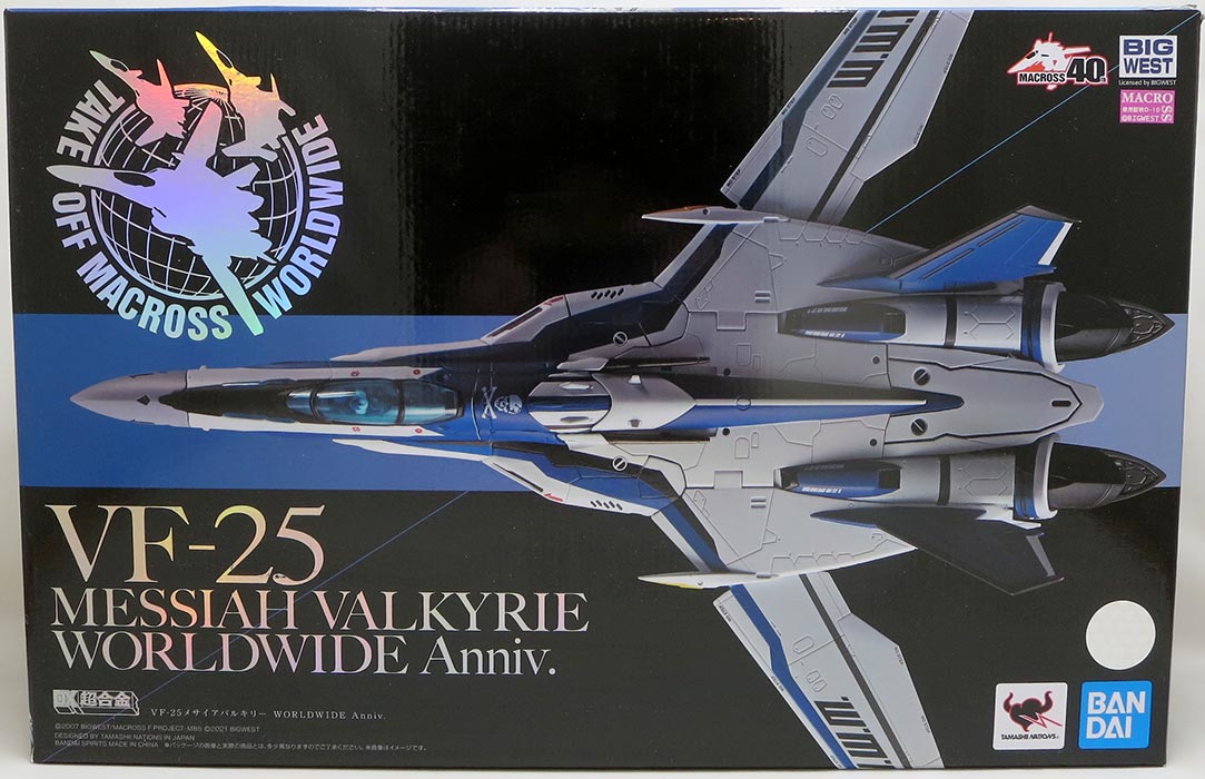 Description: A new Valkyrie, launched from Japan into the world! A special item celebrating the anniversary of the Macross series, this is a specially colored edition of the VF-25 featuring a blue-hued "Messiah" scheme. [Set Contents] Main Body, Gunpod, Assault knife, Stand, Three pairs of optional hands, Pilot.