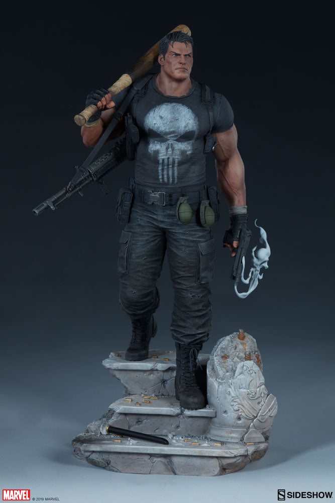 The resin Punisher Premium Format™ Figure features a sculpted costume with realistic fabric-like textures and fatigue. From the skull symbol on his chest to the distressed look of his pants, Frank Castle’s signature vigilante style is captured in immense detail. The Punisher also comes outfitted with a variety of tactical gear, including pouches, grenades, a heavy machine gun, and a freshly-fired pistol. A plume of skull-shaped smoke rises from the barrel of the gun, serving as a warning to the criminal underworld of the Marvel Universe- Frank Castle is coming to stop you.