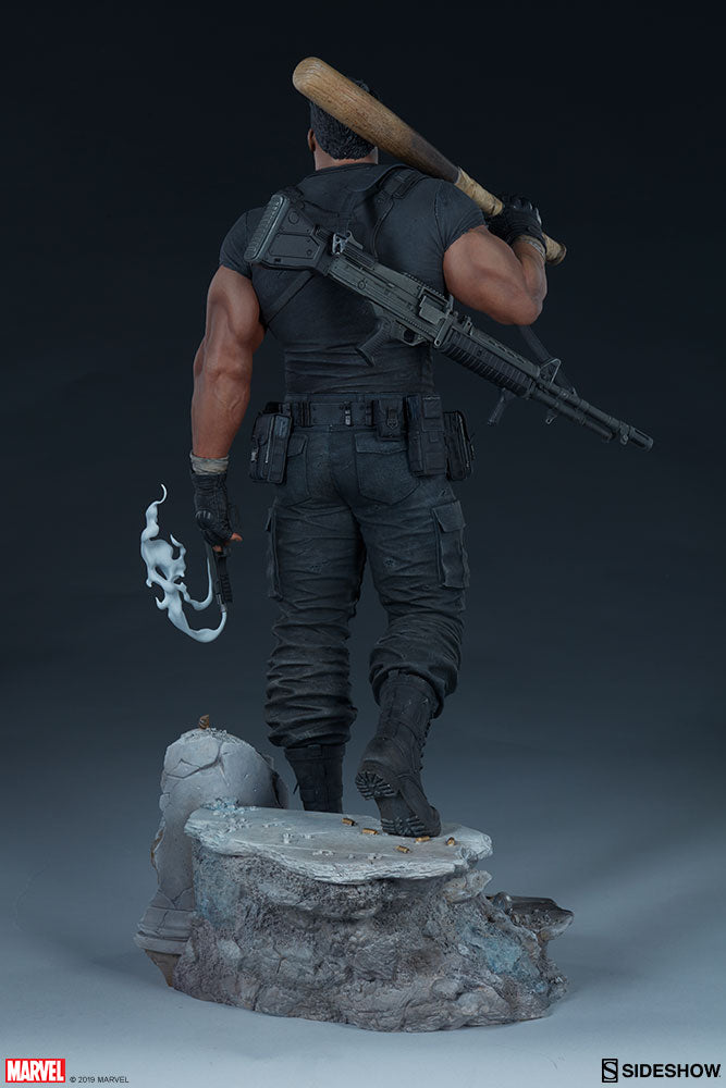 Description: The Punisher Premium Format Figure measures 22 Inch tall as Frank Castle descends the crumbling staircase of Kingpin’s manor. The monogrammed initials W. F. can be seen on the damaged stone pillar while Fisk’s iconic diamond-topped cane rests amid the ruin. Gold shell casings litter the floor, and while The Punisher might be out of bullets, he’s certainly not out of options in this fight. Clutching a splintered baseball bat, it’s up to Frank Castle to deliver his tactical brand of vigilante justice to this criminal operation.