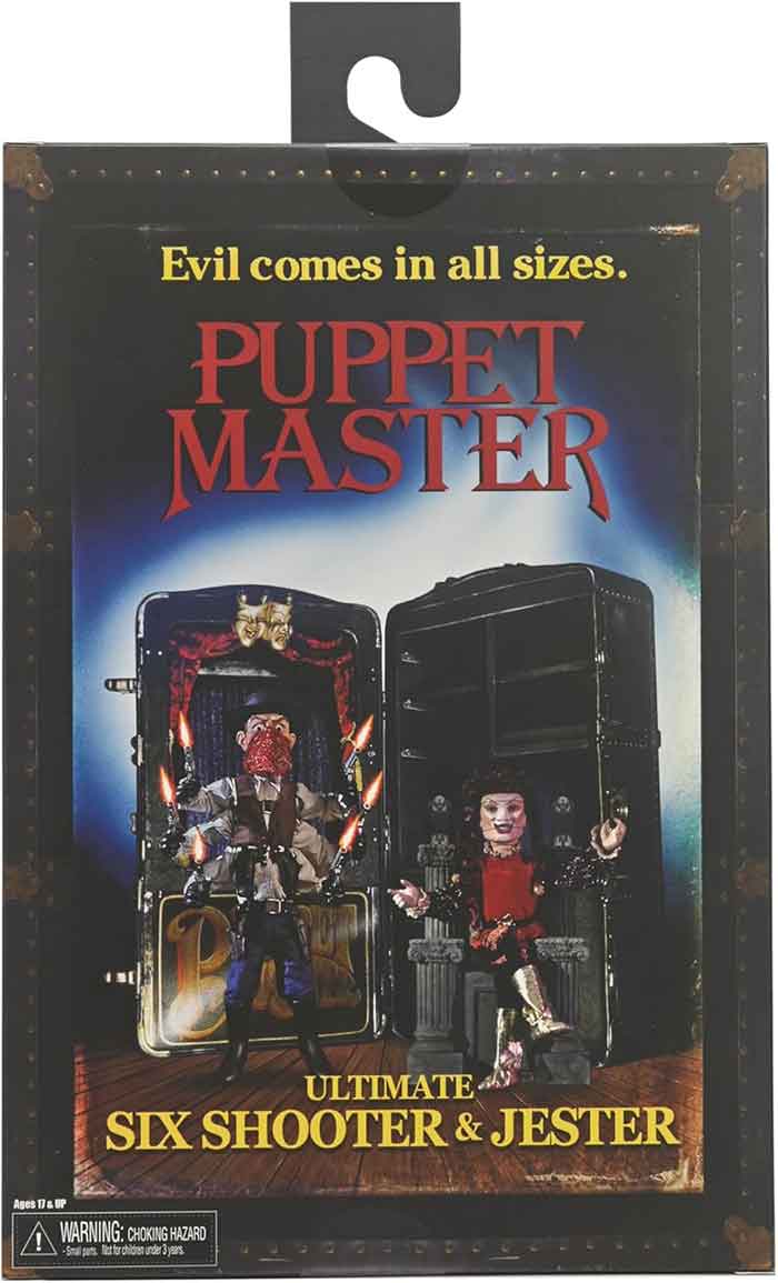 Description: NECA is proud to present the Ultimate Six-Shooter & Jester 2 Pack from the cult movie series, Puppet Master! Each figure stands approximately 4.25" tall, representing the classic look of each puppet, with accessories themed to the character's appearances in the franchise. Six-Shooter includes removable hat and bandana, interchangeable hands, and 6 revolvers. Jester includes removable fool's hat, scepter, tenderizer, scalpel, interchangeable expressions and hands. Comes in window box packaging replicating Andre Toulon's Puppet Case..