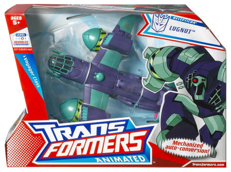 Description: LUGNUT has absolute faith in MEGATRON, and that makes him one of the most dangerous DECEPTICONS®. He is a fanatic in his support of the DECEPTICON® cause, and unquestioning in following the orders of his commander. His dedication is backed up by incredible strength, and fighting skills that led to him being feared and respected across CYBERTRON™. Each punch from his powerful hands carries the force of a small bomb, so the only way to survive a fight with him is to avoid ever letting him hit you. Unfortunately, he’s almost as fast as he is strong. Convert this DECEPTICON thug from robot mode to bomber plane vehicle mode and back again. Mechanized auto-conversion features help ease the transition. Vehicle mode features posable cannon turrets and bombs that open to reveal turbolasers! The plane’s rear stabilizers become the robot’s power mace weapon – slam its base to auto convert! Blue, black and metallic deco makes him one sleek DECEPTICON warrior for your collection. We receive both US and Canadian Cases. You will get either English, bilingual or trilingual carded figures based on availability. Please understand this before ordering.